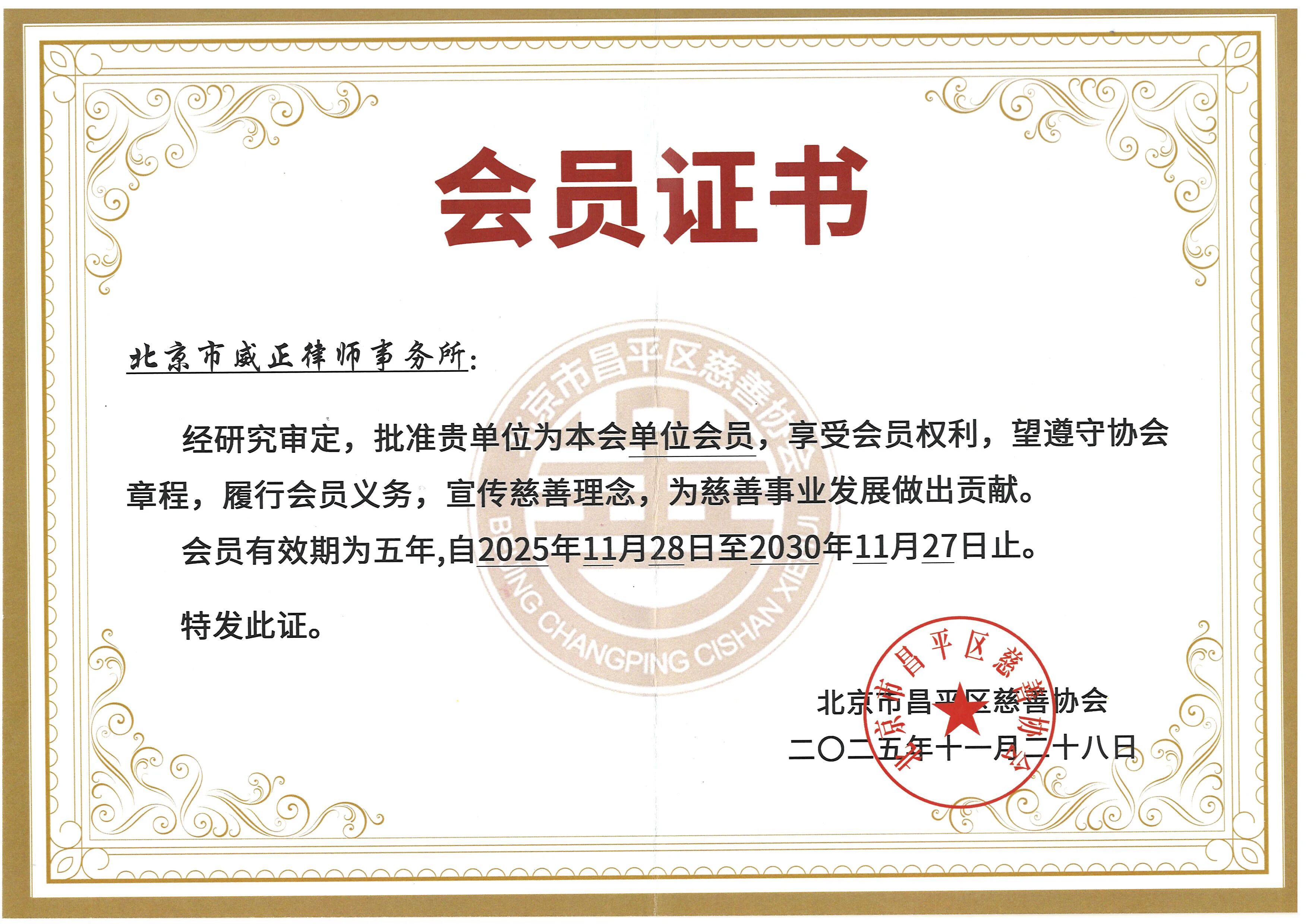 北京市威正律师事务所成为该协会会员单位,李新亮主任当选北京市昌平区慈善协会第六届理事会副会长。